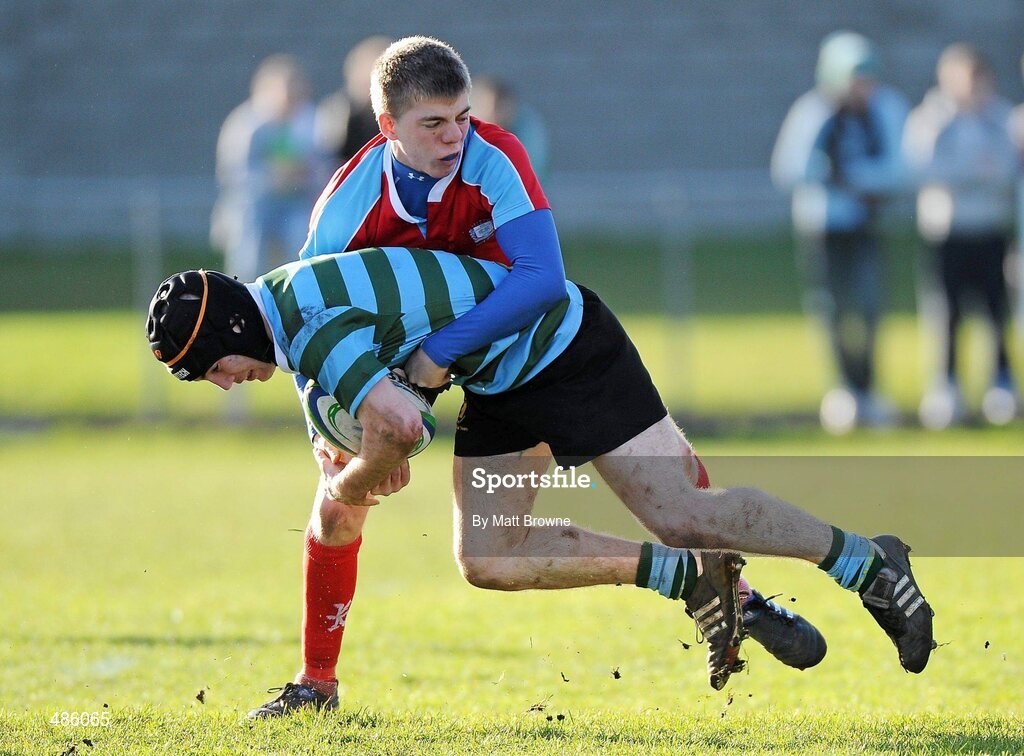 2 February 2011; David Symes, St Gerard's College, in action against Colm Driver, CUS. Powerade Leinster Schools Rugby Senior Cup, First Round, St Gerard's College v CUS, Blackrock College RFC, Stradbrook Road, Blackrock, Dublin. Picture credit: Matt Browne / SPORTSFILE