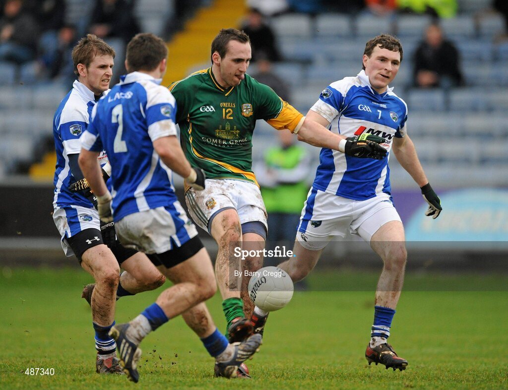 6 February 2011; Graham Reilly, Meath, in action against Gary O'Brien, left, Cormac McGuinness, right, Brian Meade, centre, Laois. Allianz Football League Division 2 Round 1, Laois v Meath, O'Moore Park, Portlaoise. Picture credit: Barry Cregg / SPORTSFILE