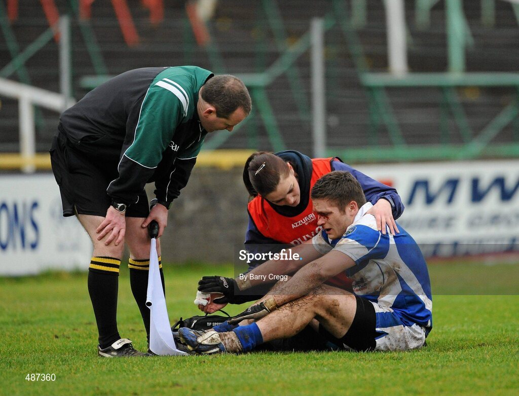 6 February 2011; Robert Kehoe, Laois, is treated for a blood injury after a heavy tackle. Allianz Football League Division 2 Round 1, Laois v Meath, O'Moore Park, Portlaoise. Picture credit: Barry Cregg / SPORTSFILE