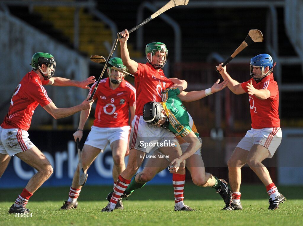 13 February 2011; Conor Mahon, Offaly, is blocked by Cork players, from left, Stephen McDonnell, William Egan, Eoin Cadogan and Shane Murphy. Allianz Hurling League, Division 1, Round 1, Cork v Offaly, Pairc Uí Chaoimh, Cork. Picture credit: David Maher / SPORTSFILE