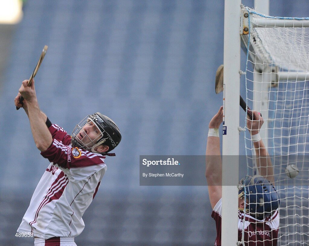13 February 2011; Sam Morrissey, left, and Enda Malone, Dicksboro, fail in their attempt to keep Barry Dwyer's long range effort from dropping into the net for Ballymartle's second goal. GAA Hurling All-Ireland Intermediate Club Final, Ballymartle, Cork, v Dicksboro, Kilkenny. Croke Park, Dublin. Picture credit: Stephen McCarthy / SPORTSFILE