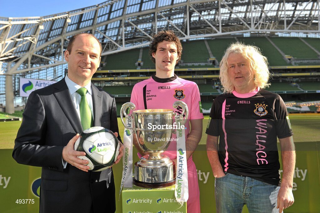 28 February 2011; At the launch of the 2011 Airtricity League are, from left, Stephen Wheeler, Managing Director Airtricity, with Wexford Youths' Paul Malone and team manager and newly elected T.D. for Wexford Mick Wallace. Airtricity League Launch Photocall, Aviva Stadium, Lansdowne Road, Dublin. Picture credit: David Maher / SPORTSFILE