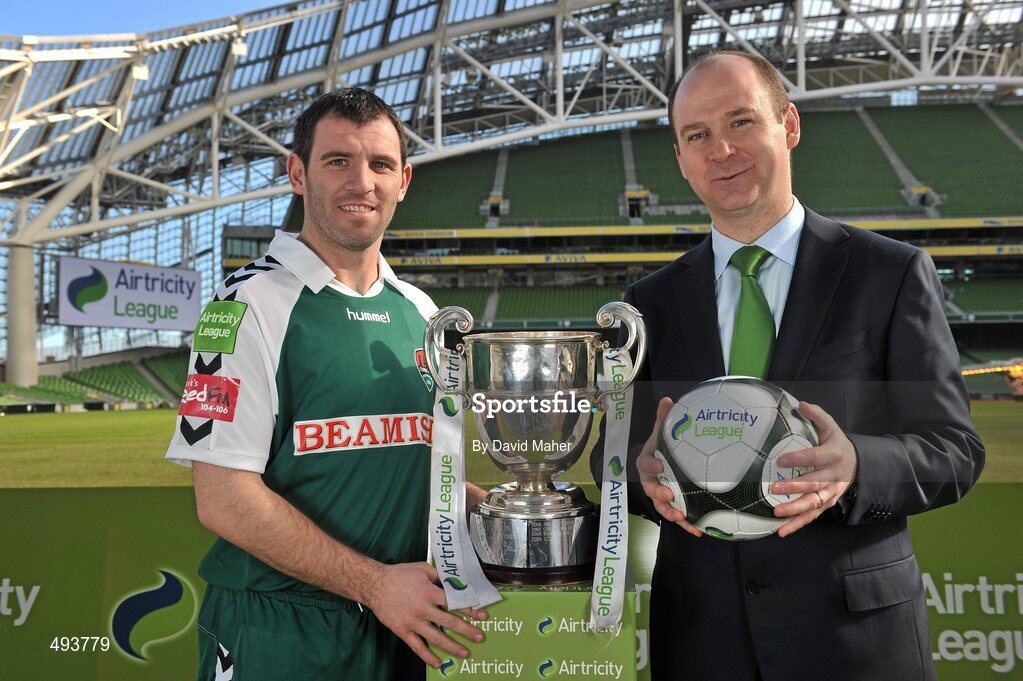 28 February 2011; At the launch of the 2011 Airtricity League are Stephen Wheeler, right, Managing Director Airtricity, with Greg O'Halloran of Cork City. Airtricity League Launch Photocall, Aviva Stadium, Lansdowne Road, Dublin. Picture credit: David Maher / SPORTSFILE