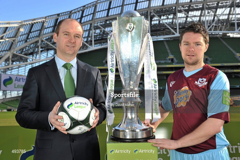28 February 2011; At the launch of the 2011 Airtricity League are Stephen Wheeler, left, Managing Director Airtricity, with Brian Gannon of Drogheda United, Co. Louth. Airtricity League Launch Photocall, Aviva Stadium, Lansdowne Road, Dublin. Picture credit: David Maher / SPORTSFILE