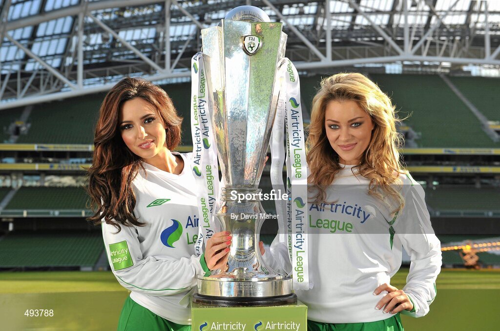 28 February 2011; At the launch of the 2011 Airtricity League are models Nadia Forde, left, and Hazel O'Sullivan. Airtricity League Launch Photocall, Aviva Stadium, Lansdowne Road, Dublin. Picture credit: David Maher / SPORTSFILE