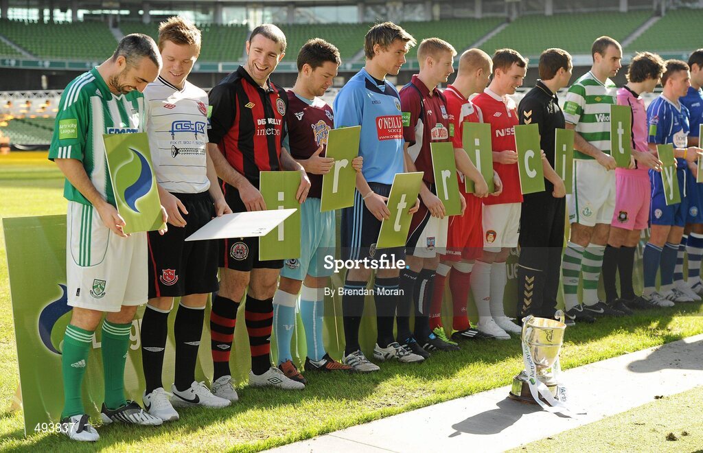 28 February 2011; Enjoying the launch of the 2011 Airtricity League are Gary Dempsey, left, Bray Wanderers, Simon Madden, Dundalk and Owen Heary, Bohemians, with players from the rest of the Premier Division and First Division clubs. Airtricity League Launch Photocall, Aviva Stadium, Lansdowne Road, Dublin. Picture credit: Brendan Moran / SPORTSFILE
