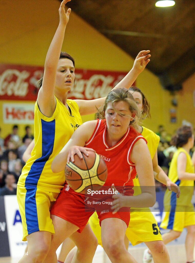 24 March 2011; Aoife Masterson, Colaiste Chiarain, Leixlip, Co. Kildare, in action against Elisha Lavelle, St. Louis Community School, Kiltimagh, Co. Mayo. Basketball Ireland Girls U16C Schools League Final, Colaiste Chiarain, Leixlip, Co. Kildare v St. Louis Community School, Kiltimagh, Co. Mayo, National Basketball Arena, Tallaght, Co. Dublin. Picture credit: Barry Cregg / SPORTSFILE