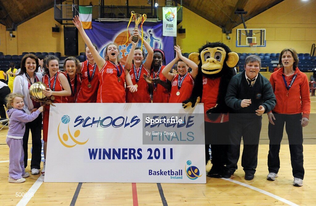 24 March 2011; The Colaiste Chiarain, Leixlip, Co. Kildare, team lift the trophy at the end of the game. Basketball Ireland Girls U16C Schools League Final, Colaiste Chiarain, Leixlip, Co. Kildare v St. Louis Community School, Kiltimagh, Co. Mayo, National Basketball Arena, Tallaght, Co. Dublin. Picture credit: Barry Cregg / SPORTSFILE