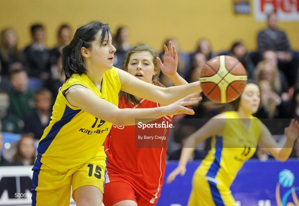 24 March 2011; Claire Shannon, St. Louis Community School, Kiltimagh, Co. Mayo, in action against Aoife Masterson, Colaiste Chiarain, Leixlip, Co. Kildare. Basketball Ireland Girls U16C Schools League Final, Colaiste Chiarain, Leixlip, Co. Kildare v St. Louis Community School, Kiltimagh, Co. Mayo, National Basketball Arena, Tallaght, Co. Dublin. Picture credit: Barry Cregg / SPORTSFILE