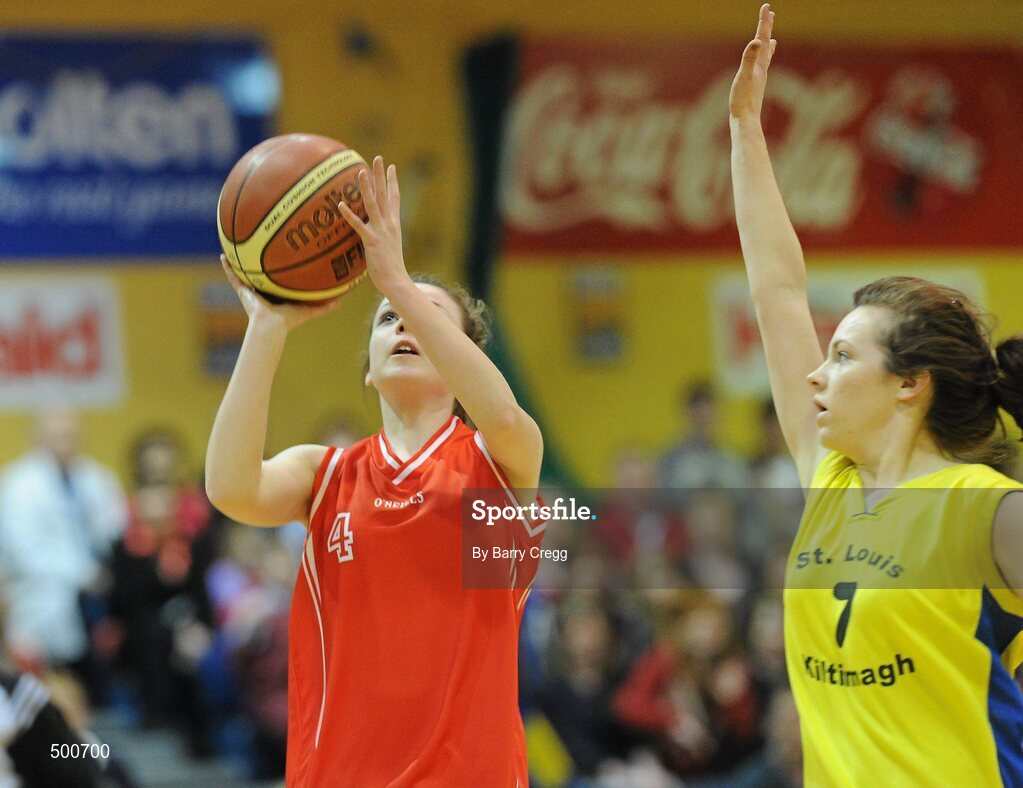 24 March 2011; Keelin Kane, Colaiste Chiarain, Leixlip, Co. Kildare, in action against Mairead Charlton, St. Louis Community School, Kiltimagh, Co. Mayo. Basketball Ireland Girls U16C Schools League Final, Colaiste Chiarain, Leixlip, Co. Kildare v St. Louis Community School, Kiltimagh, Co. Mayo, National Basketball Arena, Tallaght, Co. Dublin. Picture credit: Barry Cregg / SPORTSFILE