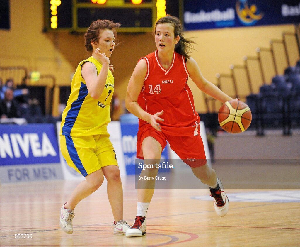 24 March 2011; Erin Bracken, right, Colaiste Chiarain, Leixlip, Co. Kildare, in action against Mairead Charlton, St. Louis Community School, Kiltimagh, Co. Mayo. Basketball Ireland Girls U16C Schools League Final, Colaiste Chiarain, Leixlip, Co. Kildare v St. Louis Community School, Kiltimagh, Co. Mayo, National Basketball Arena, Tallaght, Co. Dublin. Picture credit: Barry Cregg / SPORTSFILE