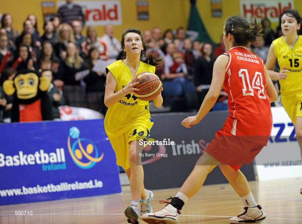 24 March 2011; Niamh Kelly, St. Louis Community School, Kiltimagh, Co. Mayo, in action against Erin Bracken, Colaiste Chiarain, Leixlip, Co. Kildare. Basketball Ireland Girls U16C Schools League Final, Colaiste Chiarain, Leixlip, Co. Kildare v St. Louis Community School, Kiltimagh, Co. Mayo, National Basketball Arena, Tallaght, Co. Dublin. Picture credit: Barry Cregg / SPORTSFILE