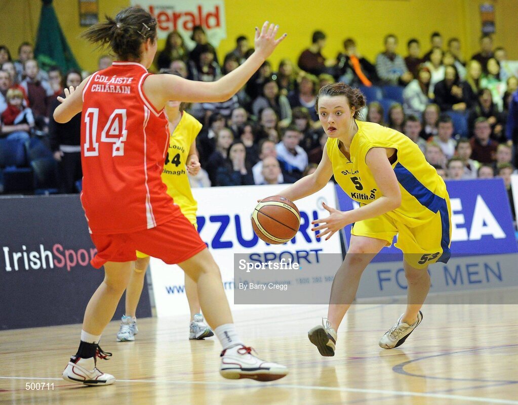 24 March 2011; Elisha Lavelle, St. Louis Community School, Kiltimagh, Co. Mayo, in action against Erin Bracken, Colaiste Chiarain, Leixlip, Co. Kildare. Basketball Ireland Girls U16C Schools League Final, Colaiste Chiarain, Leixlip, Co. Kildare v St. Louis Community School, Kiltimagh, Co. Mayo, National Basketball Arena, Tallaght, Co. Dublin. Picture credit: Barry Cregg / SPORTSFILE