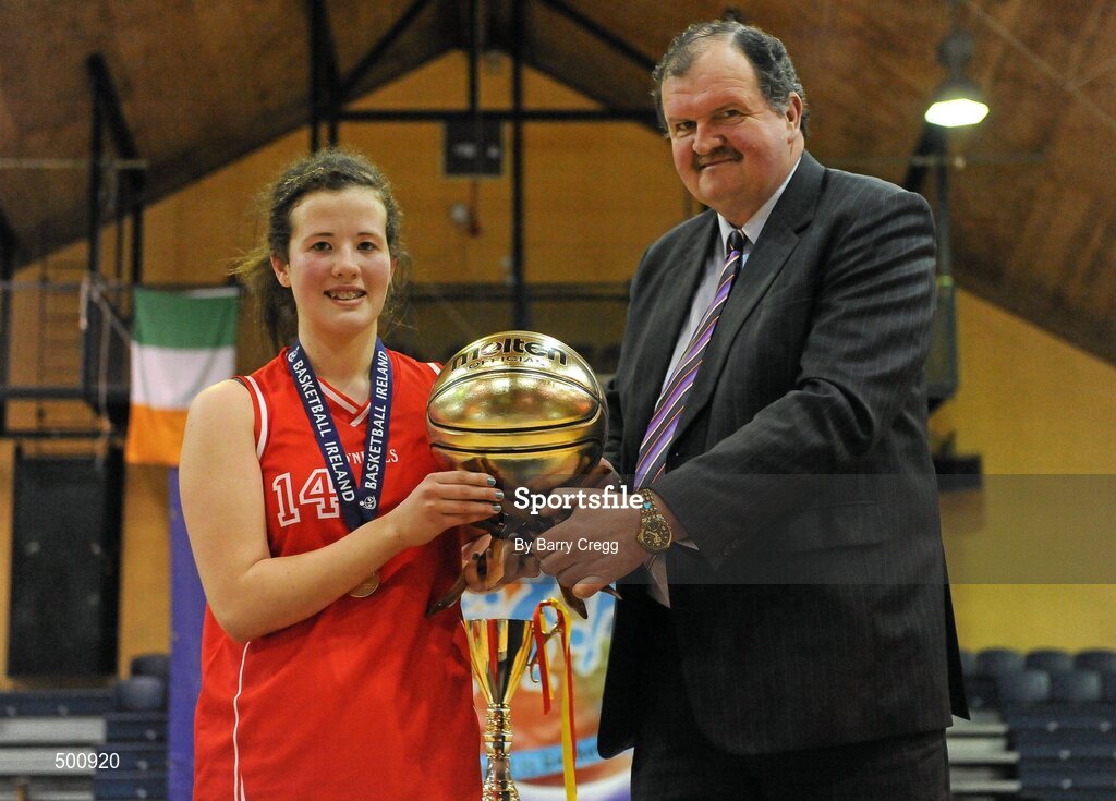 24 March 2011; Colaiste Chiarain, Leixlip, Co. Kildare, captain Erin Bracken receives the Most Valuable Player award from Bernard O'Byrne, General Secretary of Basketball Ireland. Basketball Ireland Girls U16C Schools League Final, Colaiste Chiarain, Leixlip, Co. Kildare v St. Louis Community School, Kiltimagh, Co. Mayo, National Basketball Arena, Tallaght, Co. Dublin. Picture credit: Barry Cregg / SPORTSFILE