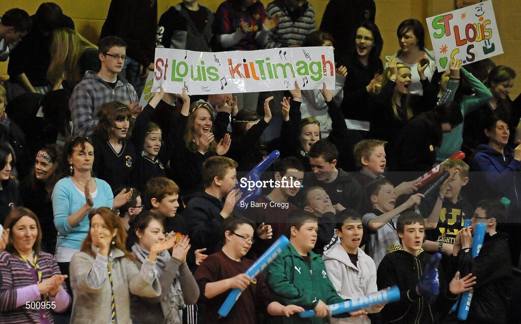 24 March 2011; St. Louis Community School, Kiltimagh, Co. Mayo, fans cheer on their team during the game. Basketball Ireland Girls U16C Schools League Final, Colaiste Chiarain, Leixlip, Co. Kildare v St. Louis Community School, Kiltimagh, Co. Mayo, National Basketball Arena, Tallaght, Co. Dublin. Picture credit: Barry Cregg / SPORTSFILE