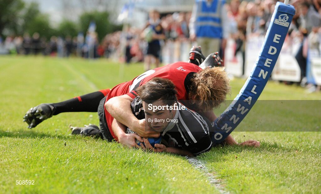 24 April 2011; Darren Guest, Dundalk RFC, goes over for a try, despite being tackled by Dave Hanlon, Tullamore RFC, the try was subsequently not awarded due to a forward pass. Newstalk Provincial Towns Cup Final, Dundalk RFC v Tullamore RFC, Edenderry RFC, Coolavacoose, Carbury, Co. Kildare. Picture credit: Barry Cregg / SPORTSFILE