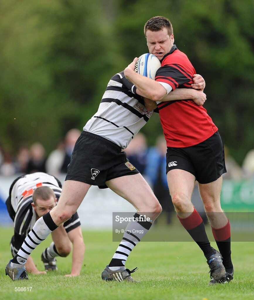 24 April 2011; Colin Hughes, Tullamore RFC, is tackled by Chris Scully, Dundalk RFC. Newstalk Provincial Towns Cup Final, Dundalk RFC v Tullamore RFC, Edenderry RFC, Coolavacoose, Carbury, Co. Kildare. Picture credit: Barry Cregg / SPORTSFILE