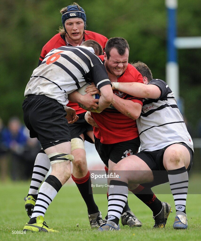 24 April 2011; Ger Molloy, Tullamore RFC, with support from team-mate Ivor Deverell, is tackled by Paul Meegan, left, and Cillian McDonald, Dundalk RFC. Newstalk Provincial Towns Cup Final, Dundalk RFC v Tullamore RFC, Edenderry RFC, Coolavacoose, Carbury, Co. Kildare. Picture credit: Barry Cregg / SPORTSFILE
