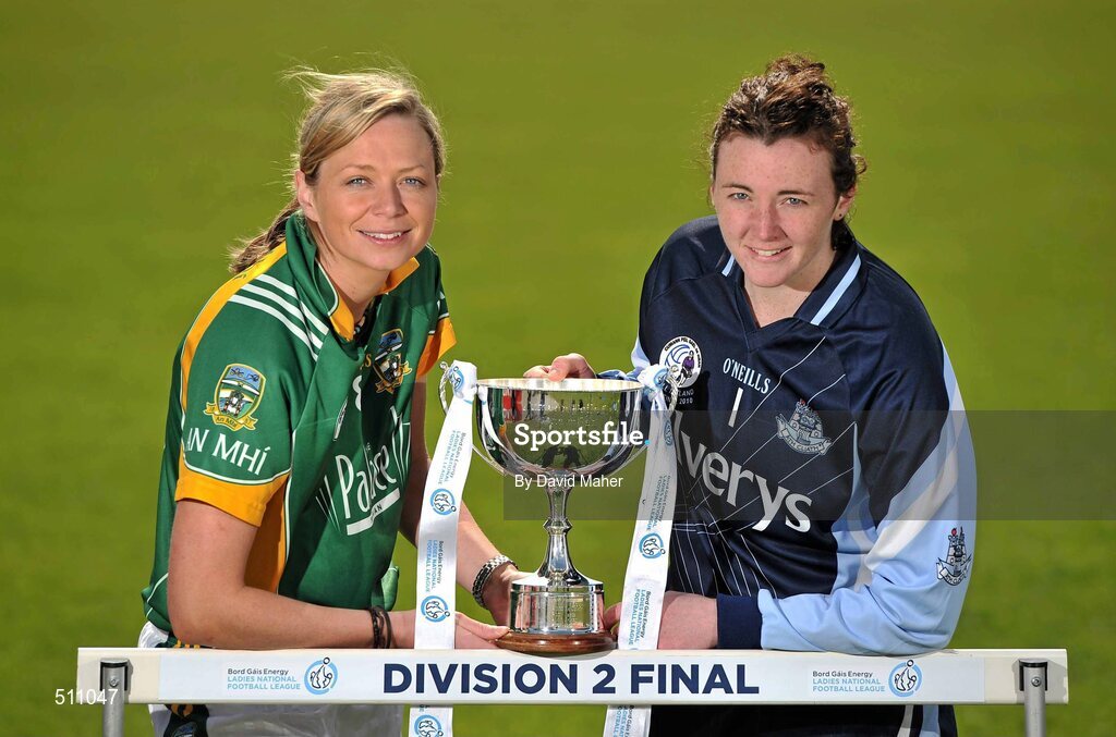 3 May 2011; At Parnell Park today ahead of the Bord Gáis Energy Ladies NFL Division 2 Final are Grainne Nulty, Meath captain, left, and Cliodhna O'Connor, Dublin captain. All three Bord Gáis Energy Ladies NFL Finals will be held in Parnell Park on Saturday, 7th May and all three finals will be broadcast live on TG4. In the Division 3 final Fermanagh take on Clare at 1.45pm. In the Division 2 final at 3.30pm Dublin take on Meath, while at 5.15pm in the Division 1 final Cork take on Laois. Bord Gáis Energy Ladies National Football League Captain's Day, Parnell Park, Dublin. Picture credit: David Maher / SPORTSFILE