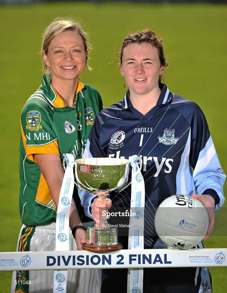 3 May 2011; At Parnell Park today ahead of the Bord Gáis Energy Ladies NFL Division 2 Final are Grainne Nulty, Meath captain, left, and Cliodhna O'Connor, Dublin captain. All three Bord Gáis Energy Ladies NFL Finals will be held in Parnell Park on Saturday, 7th May and all three finals will be broadcast live on TG4. In the Division 3 final Fermanagh take on Clare at 1.45pm. In the Division 2 final at 3.30pm Dublin take on Meath, while at 5.15pm in the Division 1 final Cork take on Laois. Bord Gáis Energy Ladies National Football League Captain's Day, Parnell Park, Dublin. Picture credit: David Maher / SPORTSFILE