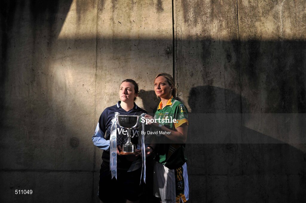3 May 2011; At Parnell Park today ahead of the Bord Gáis Energy Ladies NFL Division 2 Final are Grainne Nulty, Meath captain, right, and Cliodhna O'Connor, Dublin captain. All three Bord Gáis Energy Ladies NFL Finals will be held in Parnell Park on Saturday, 7th May and all three finals will be broadcast live on TG4. In the Division 3 final Fermanagh take on Clare at 1.45pm. In the Division 2 final at 3.30pm Dublin take on Meath, while at 5.15pm in the Division 1 final Cork take on Laois. Bord Gáis Energy Ladies National Football League Captain's Day, Parnell Park, Dublin. Picture credit: David Maher / SPORTSFILE