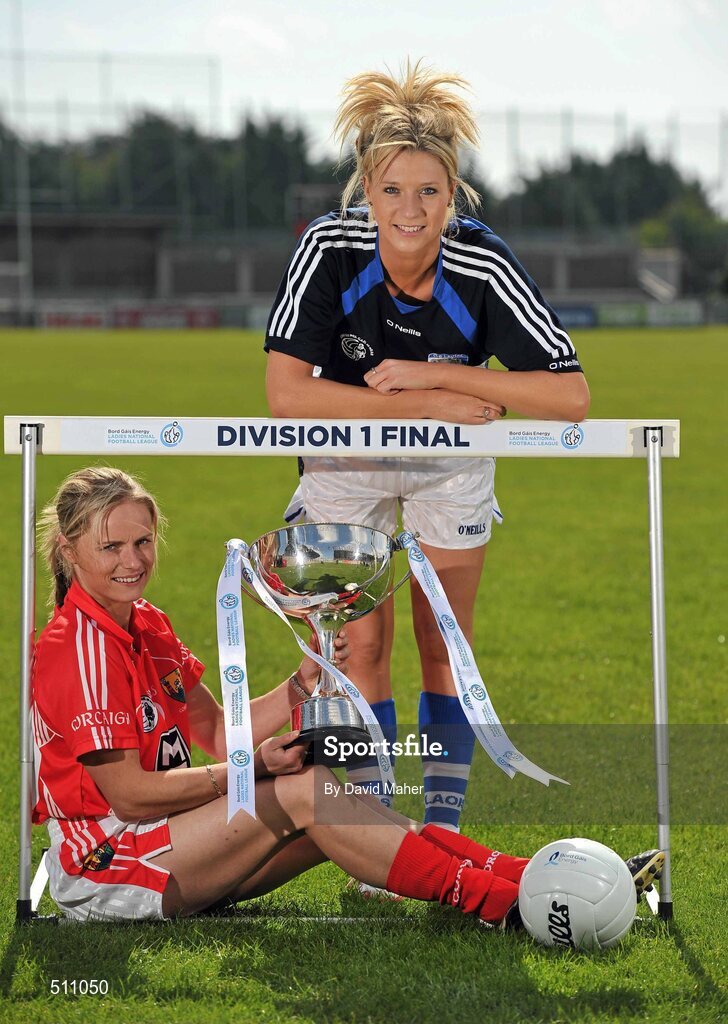 3 May 2011; At Parnell Park today ahead of the Bord Gáis Energy Ladies NFL Division 1 Final are Amy O’Shea, Cork captain, left, and Aisling Quigley, Laois captain. All three Bord Gáis Energy Ladies NFL Finals will be held in Parnell Park on Saturday, 7th May and all three finals will be broadcast live on TG4. In the Division 3 final Fermanagh take on Clare at 1.45pm. In the Division 2 final at 3.30pm Dublin take on Meath, while at 5.15pm in the Division 1 final Cork take on Laois. Bord Gáis Energy Ladies National Football League Captain's Day, Parnell Park, Dublin. Picture credit: David Maher / SPORTSFILE