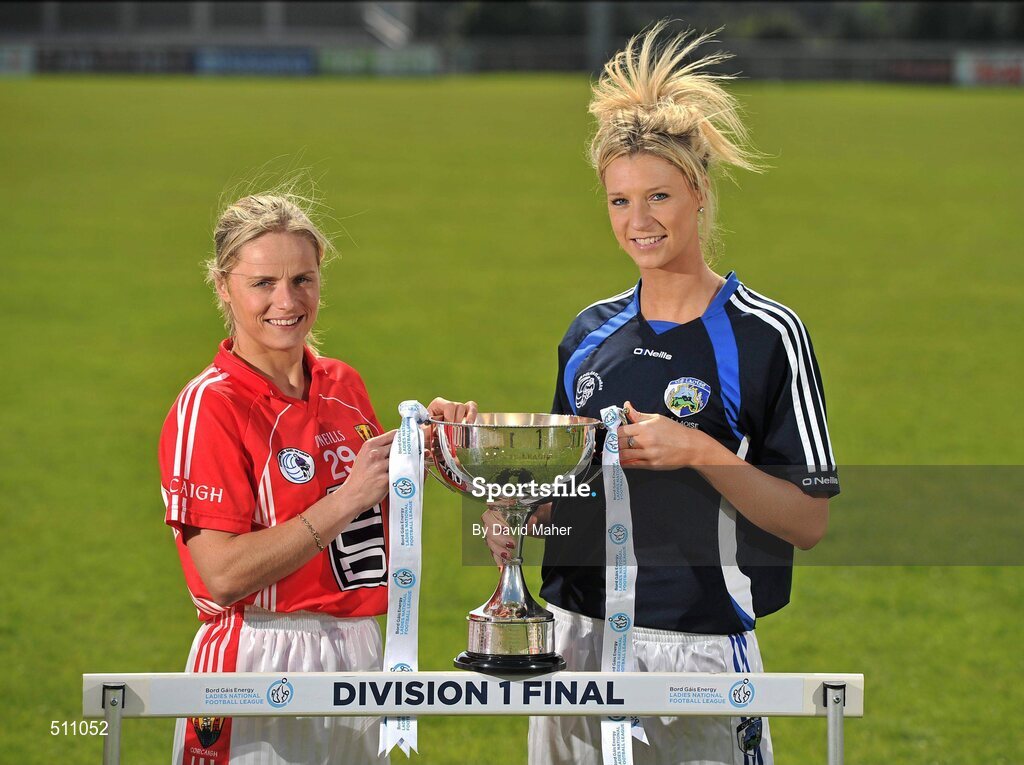 3 May 2011; At Parnell Park today ahead of the Bord Gáis Energy Ladies NFL Division 1 Final are Amy O’Shea, Cork captain, left, and Aisling Quigley, Laois captain. All three Bord Gáis Energy Ladies NFL Finals will be held in Parnell Park on Saturday, 7th May and all three finals will be broadcast live on TG4. In the Division 3 final Fermanagh take on Clare at 1.45pm. In the Division 2 final at 3.30pm Dublin take on Meath, while at 5.15pm in the Division 1 final Cork take on Laois. Bord Gáis Energy Ladies National Football League Captain's Day, Parnell Park, Dublin. Picture credit: David Maher / SPORTSFILE