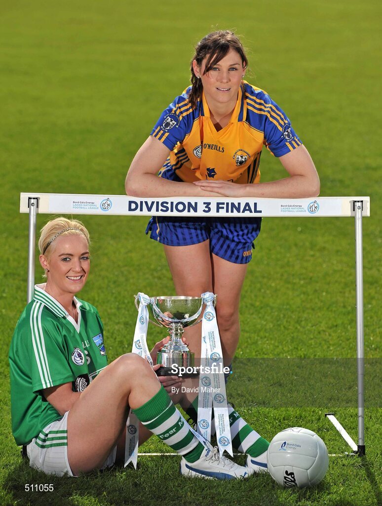 3 May 2011; At Parnell Park today ahead of the Bord Gáis Energy Ladies NFL Division 3 Final are Niamh Keane, Clare captain, right, and Tara Hughes, Fermanagh captain. All three Bord Gáis Energy Ladies NFL Finals will be held in Parnell Park on Saturday, 7th May and all three finals will be broadcast live on TG4. In the Division 3 final Fermanagh take on Clare at 1.45pm. In the Division 2 final at 3.30pm Dublin take on Meath, while at 5.15pm in the Division 1 final Cork take on Laois. Bord Gáis Energy Ladies National Football League Captain's Day, Parnell Park, Dublin. Picture credit: David Maher / SPORTSFILE
