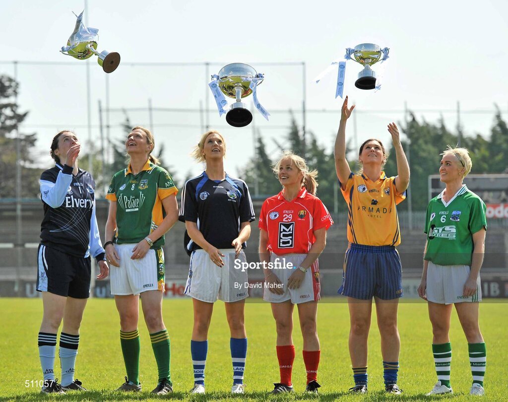 3 May 2011; At Parnell Park today ahead of the Bord Gáis Energy Ladies NFL Division 1 Final are captains, from left to right, Cliodhna O'Connor, Dublin, Grainne Nulty, Meath, Aisling Quigley, Laois, Amy O’Shea, Cork, Niamh Keane, Clare, and Tara Hughes, Fermanagh. All three Bord Gáis Energy Ladies NFL Finals will be held in Parnell Park on Saturday, 7th May and all three finals will be broadcast live on TG4. In the Division 3 final Fermanagh take on Clare at 1.45pm. In the Division 2 final at 3.30pm Dublin take on Meath, while at 5.15pm in the Division 1 final Cork take on Laois. Bord Gáis Energy Ladies National Football League Captain's Day, Parnell Park, Dublin. Picture credit: David Maher / SPORTSFILE