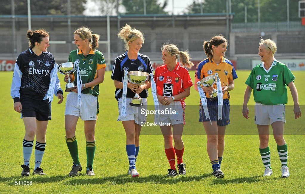 3 May 2011; At Parnell Park today ahead of the Bord Gáis Energy Ladies NFL Division 1 Final are captains, from left to right, Cliodhna O'Connor, Dublin, Grainne Nulty, Meath, Aisling Quigley, Laois, Amy O’Shea, Cork, Niamh Keane, Clare, and Tara Hughes, Fermanagh. All three Bord Gáis Energy Ladies NFL Finals will be held in Parnell Park on Saturday, 7th May and all three finals will be broadcast live on TG4. In the Division 3 final Fermanagh take on Clare at 1.45pm. In the Division 2 final at 3.30pm Dublin take on Meath, while at 5.15pm in the Division 1 final Cork take on Laois. Bord Gáis Energy Ladies National Football League Captain's Day, Parnell Park, Dublin. Picture credit: David Maher / SPORTSFILE