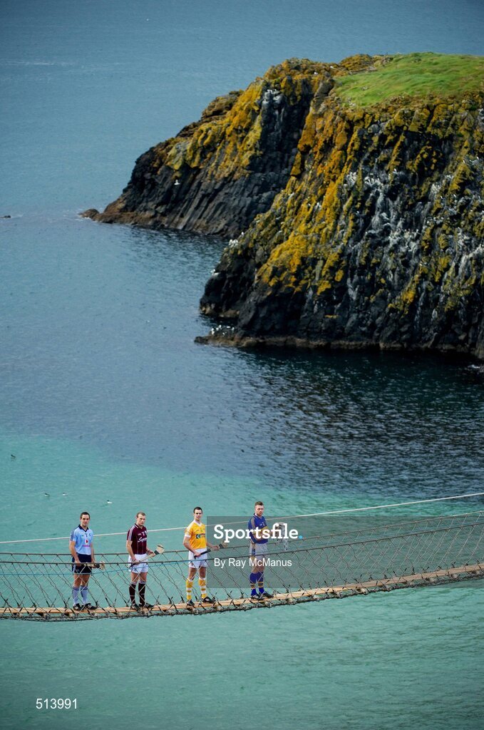 11 May 2011; At the launch of the 2011 GAA Hurling All-Ireland Senior Championship on the Carrick-a-Rede Rope Bridge in Co. Antrim, are, from left, Tomás Brady, Dublin, Cyril Donnellan, Galway, Neil McManus, Antrim, and Páraic Maher, Tipperary. Launch of 2011 GAA Hurling All-Ireland Senior Championship, Dunloy, Co. Antrim. Picture credit: Ray McManus / SPORTSFILE