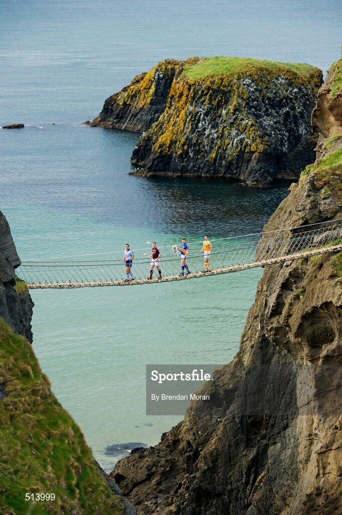 11 May 2011; At the launch of the 2011 GAA Hurling All-Ireland Senior Championship on the Carrick-a-Rede Rope Bridge in Co. Antrim, are, from left, Tomás Brady, Dublin, Cyril Donnellan, Galway, Páraic Maher, Tipperary, and Neil McManus, Antrim. Launch of 2011 GAA Hurling All-Ireland Senior Championship, Dunloy, Co. Antrim. Picture credit: Brendan Moran / SPORTSFILE