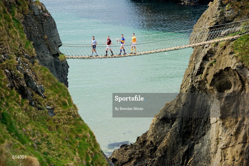 11 May 2011; At the launch of the 2011 GAA Hurling All-Ireland Senior Championship on the Carrick-a-Rede Rope Bridge in Co. Antrim, are, from left, Tomás Brady, Dublin, Cyril Donnellan, Galway, Páraic Maher, Tipperary, and Neil McManus, Antrim. Launch of 2011 GAA Hurling All-Ireland Senior Championship, Dunloy, Co. Antrim. Picture credit: Brendan Moran / SPORTSFILE