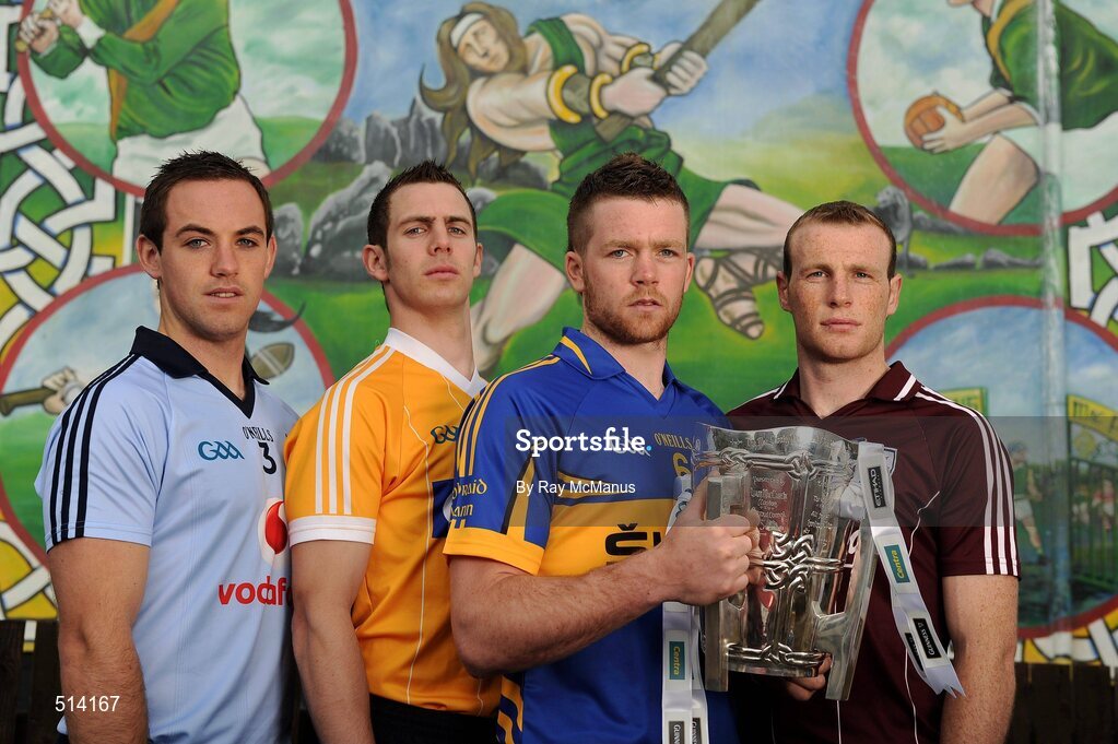 11 May 2011; At the launch of the 2011 GAA Hurling All-Ireland Senior Championship in Dunloy Cuchullains, Co. Antrim, are, from left, Tomás Brady, Dublin, Neil McManus, Antrim, Páraic Maher, Tipperary, and Cyril Donnellan, Galway. Launch of 2011 GAA Hurling All-Ireland Senior Championship, Dunloy, Co. Antrim. Picture credit: Ray McManus / SPORTSFILE