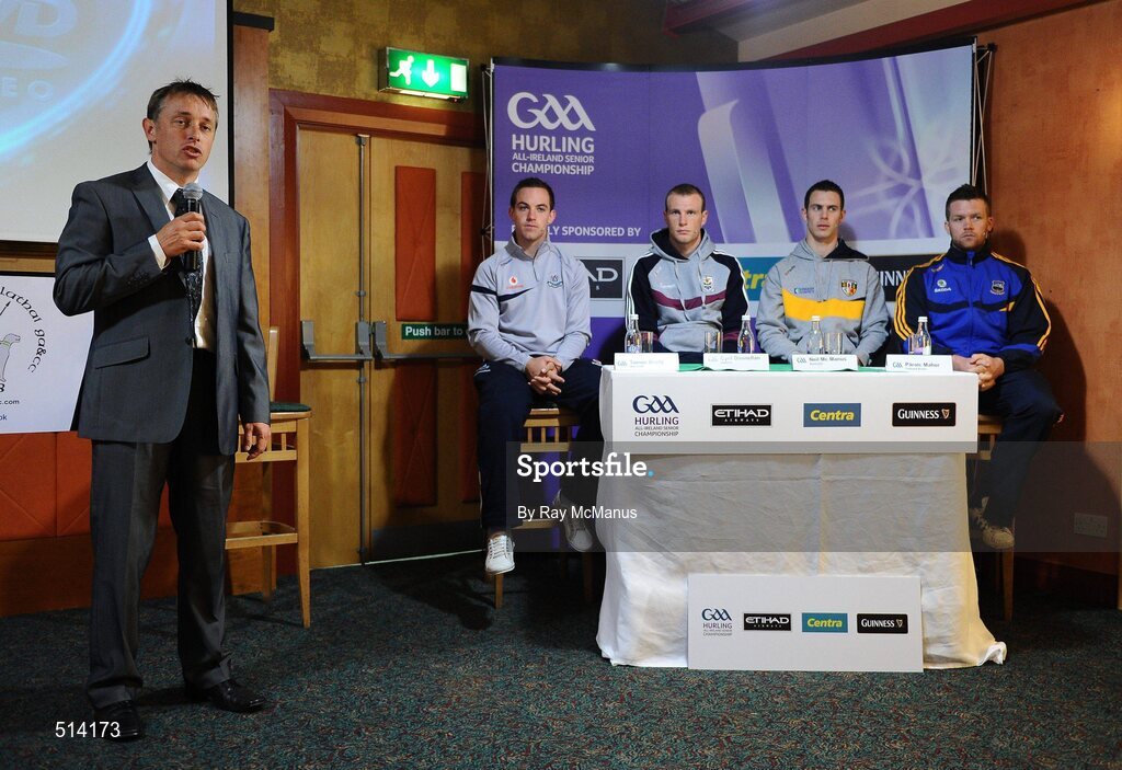 11 May 2011; At the launch of the 2011 GAA Hurling All-Ireland Senior Championship in Dunloy Cuchullains, Co. Antrim, are, from left, MC Michéal O Domhnaill, Tomás Brady, Dublin, Cyril Donnellan, Galway, Neil McManus, Antrim, and Páraic Maher, Tipperary. Launch of 2011 GAA Hurling All-Ireland Senior Championship, Dunloy, Co. Antrim. Picture credit: Ray McManus / SPORTSFILE