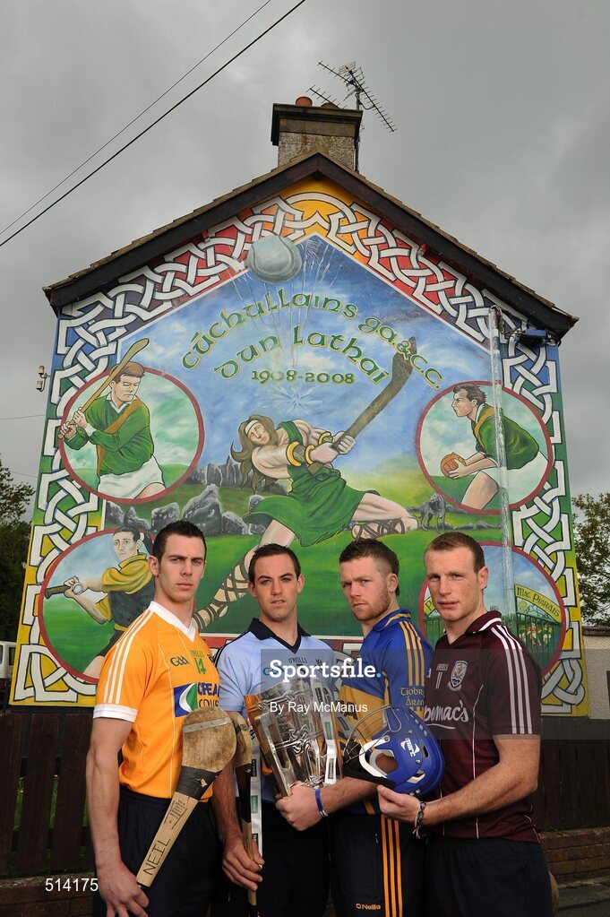11 May 2011; At the launch of the 2011 GAA Hurling All-Ireland Senior Championship in Dunloy Cuchullains, Co. Antrim, are, from left, Tomás Brady, Dublin, Neil McManus, Antrim, Páraic Maher, Tipperary, and Cyril Donnellan, Galway. Launch of 2011 GAA Hurling All-Ireland Senior Championship, Dunloy, Co. Antrim. Picture credit: Ray McManus / SPORTSFILE