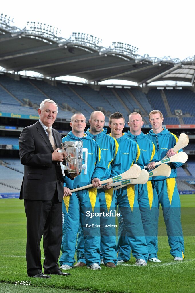 13 May 2011; Uachtarán Chumann Lúthchleas Gael Criostóir Ó Cuana, with Centra’s GAA Hurling Ambassadors for 2011, from left, David O’Callaghan, Dublin, Ger Farragher, Galway, Patrick Horgan, Cork, John Mullane, Waterford, and Henry Shefflin, Kilkenny, today launched Centra’s exciting programme of activity for the GAA Hurling All-Ireland Senior Championship. Centra, sponsor of the GAA Hurling All Ireland Championship have lined up some of the greatest stars of the game to take the hurling message out into the community by organising the Centra Hurling Skills Tour which will run from Saturday 4th June to Saturday 9th July. The tour will feature Centra’s Hurling Ambassadors and will take place in Tipperary, Offaly, Kilkenny, Cork, Dublin, and Galway. Each Centra Skills Session will feature two of the hurling Ambassadors, giving Ireland’s future hurlers the chance to train with the best in the game and the good news is that they are free of charge – registration will take place in Centra stores in the relevant counties. For more information log onto www.centra.ie or Facebook.com/centra. Croke Park, Dublin. Picture credit: Brian Lawless / SPORTSFILE