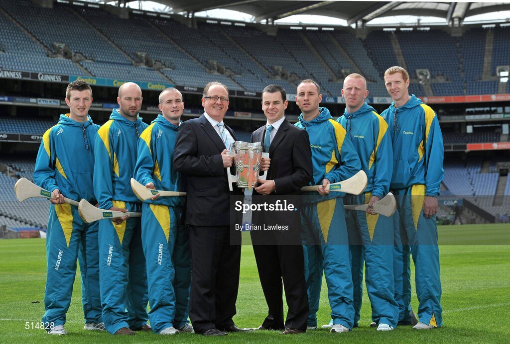 13 May 2011; Martin Kelleher, Managing Director, Centra, fourth from left, and Michael Morgan, Sales Director, Centra, with Centra’s GAA Hurling Ambassadors for 2011, from left, Patrick Horgan, Cork, Ger Farragher, Galway, David O’Callaghan, Dublin, Eoin Kelly, Tipperary, John Mullane, Waterford, and Henry Shefflin, Kilkenny, at the launch of Centra’s exciting programme of activity for the GAA Hurling All-Ireland Senior Championship. Centra, sponsor of the GAA Hurling All Ireland Championship have lined up some of the greatest stars of the game to take the hurling message out into the community by organising the Centra Hurling Skills Tour which will run from Saturday 4th June to Saturday 9th July. The tour will feature Centra’s Hurling Ambassadors and will take place in Tipperary, Offaly, Kilkenny, Cork, Dublin, and Galway. Each Centra Skills Session will feature two of the hurling Ambassadors, giving Ireland’s future hurlers the chance to train with the best in the game and the good news is that they are free of charge – registration will take place in Centra stores in the relevant counties. For more information log onto www.centra.ie or Facebook.com/centra. Croke Park, Dublin. Picture credit: Brian Lawless / SPORTSFILE