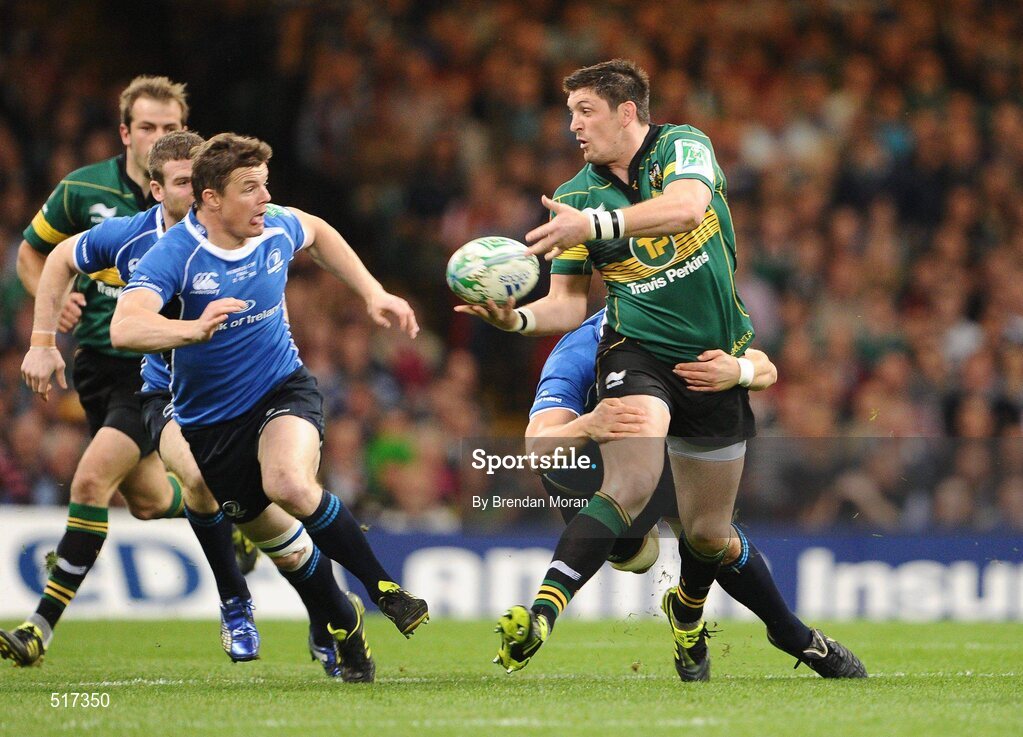 21 May 2011; James Downey, Northampton Saints, is tackled by Sean O'Brien and Brian O'Driscoll, left, Leinster. Heineken Cup Final, Leinster v Northampton Saints, Millennium Stadium, Cardiff, Wales. Picture credit: Brendan Moran / SPORTSFILE