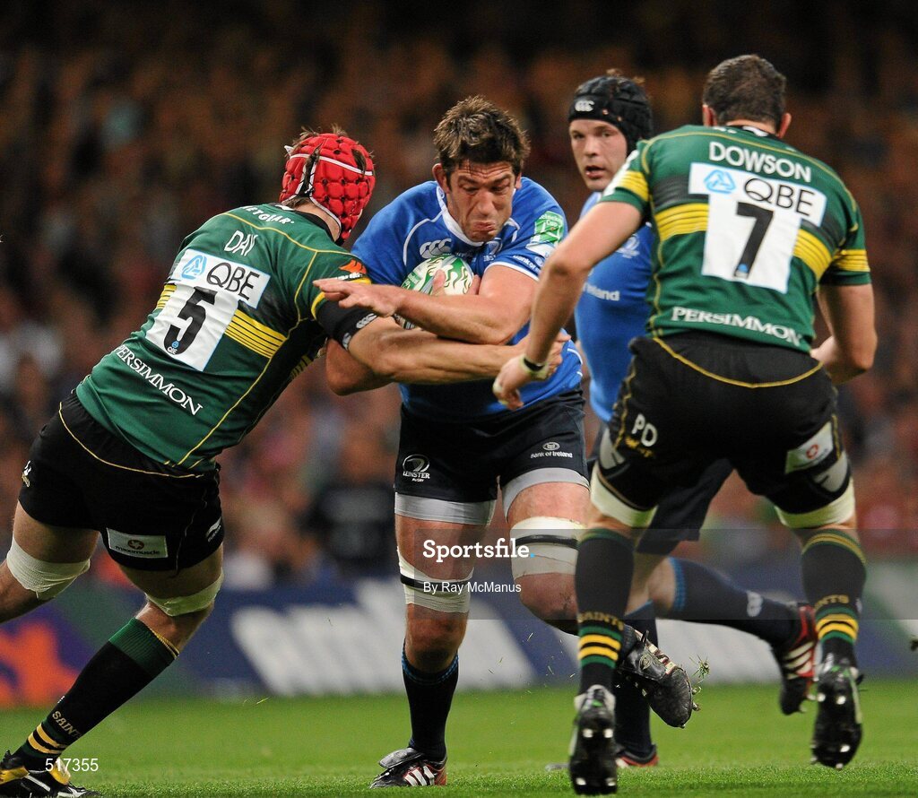 21 May 2011; Nathan Hines, Leinster, is tackled by Christian Day, left, and Phil Dowson, Northampton Saints. Heineken Cup Final, Leinster v Northampton Saints, Millennium Stadium, Cardiff, Wales. Picture credit: Ray McManus / SPORTSFILE