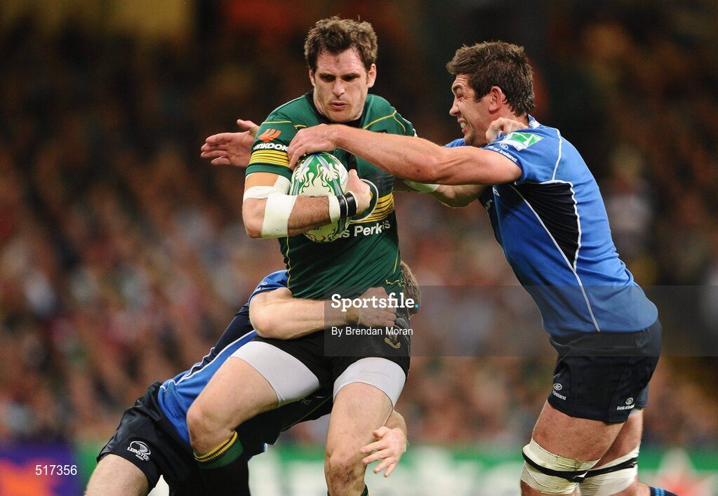21 May 2011; Jon Clarke, Northampton Saints, is tackled by Gordon D'Arcy, left, and Nathan Hines. Heineken Cup Final, Leinster v Northampton Saints, Millennium Stadium, Cardiff, Wales. Picture credit: Brendan Moran / SPORTSFILE