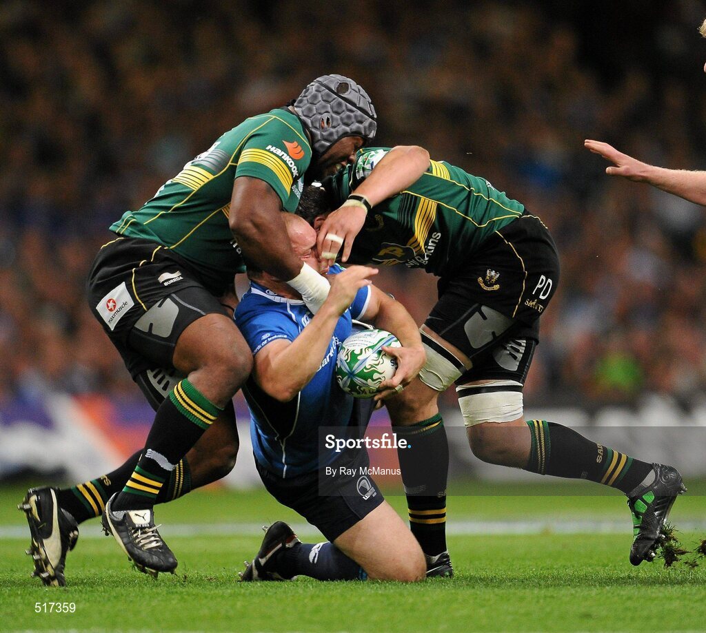21 May 2011; Richardt Strauss, Leinster, is tackled by Brian Mujati, left, and Phil Dowson, Northampton Saints. Heineken Cup Final, Leinster v Northampton Saints, Millennium Stadium, Cardiff, Wales. Picture credit: Ray McManus / SPORTSFILE