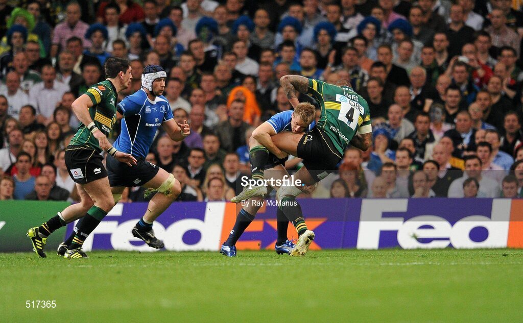 21 May 2011; Courtney Lawes, Northampton Saints, supported by James Downey, is tackled by Luke Fitzgerald, Leinster. Heineken Cup Final, Leinster v Northampton Saints, Millennium Stadium, Cardiff, Wales. Picture credit: Ray McManus / SPORTSFILE