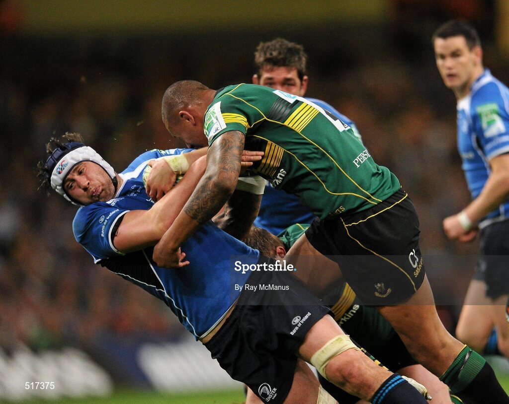 21 May 2011; Kevin McLaughlin, Leinster, is tackled by Courtney Lawes, Northampton Saints. Heineken Cup Final, Leinster v Northampton Saints, Millennium Stadium, Cardiff, Wales. Picture credit: Ray McManus / SPORTSFILE
