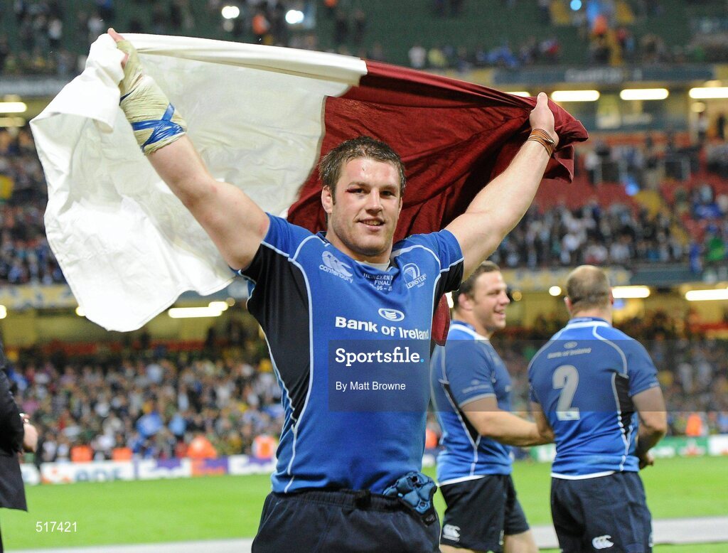 21 May 2011; Leinster's Sean O'Brien celebrates with his hometown flag, of Tullow RFC, Co. Carlow, after the game. Heineken Cup Final, Leinster v Northampton Saints, Millennium Stadium, Cardiff, Wales. Picture credit: Matt Browne / SPORTSFILE