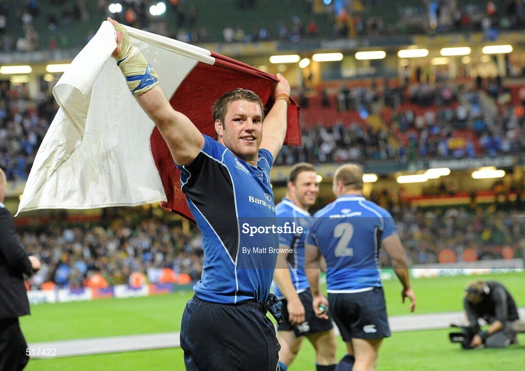 21 May 2011; Leinster's Sean O'Brien celebrates with his hometown flag from Tullow RFC, Co. Carlow. Heineken Cup Final, Leinster v Northampton Saints, Millennium Stadium, Cardiff, Wales. Picture credit: Matt Browne / SPORTSFILE