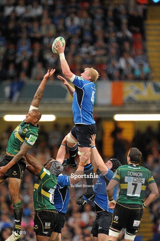 21 May 2011; Leo Cullen, Leinster, wins possession for his side in the lineout ahead of Courtney Lawes, Northampton Saints. Heineken Cup Final, Leinster v Northampton Saints, Millennium Stadium, Cardiff, Wales. Picture credit: Matt Browne / SPORTSFILE