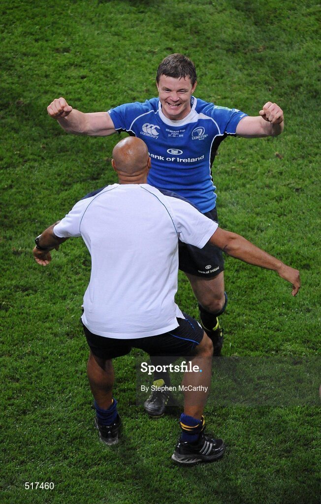 21 May 2011; Leinster's Brian O'Driscoll celebrates with Leinster masseur Mike Thompson following their side's victory. Heineken Cup Final, Leinster v Northampton Saints, Millennium Stadium, Cardiff, Wales. Picture credit: Stephen McCarthy / SPORTSFILE