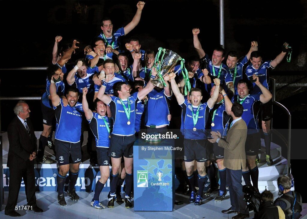 21 May 2011; Leinster players Shane Horgan, Leo Cullen and Gordon D'Arcy lift the Heineken Cup. Heineken Cup Final, Leinster v Northampton Saints, Millennium Stadium, Cardiff, Wales. Picture credit: Stephen McCarthy / SPORTSFILE
