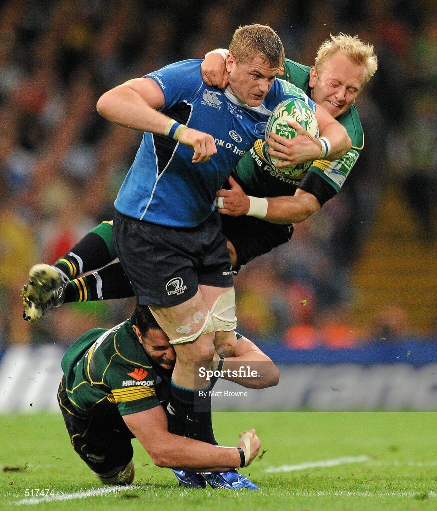 21 May 2011; Jamie Heaslip, Leinster, is tackled by Phil Dowson and Shane Geraghty, right, Northampton Saints. Heineken Cup Final, Leinster v Northampton Saints, Millennium Stadium, Cardiff, Wales. Picture credit: Matt Browne / SPORTSFILE